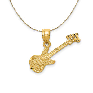 Rock on in musical style with this detailed guitar pendant fashioned from 14k yellow gold with a satin and diamond-cut finish. It is approximately 9mm (3/8 Inch) in width by 25mm (1 Inch) in length and dangles from a tapered bail. The pendant is . Includes a 30 Inch, 0.8mm 14k yellow gold cable chain with a lobster clasp.