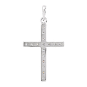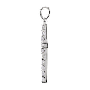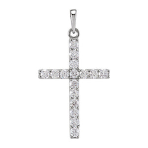 Celebrate and honor all special occasions with jewelry of religious significance! Our collection of spiritually inspired designs that show faith, hope and devotion are perfect for commemorating life's milestones. This Latin cross pendant created in rhodium-plated 14k white gold is prong set with 16 natural diamonds that are 2.4mm in size, I1 in clarity and G-H in color. The total diamond weight is 3/4 carat. The approximate pendant size is 18mm (11/16 inch) in width by 32mm (1 1/4 inch) in length. The chain passage dimensions of the bail are 3.2 x 3mm. This item does not include a chain. This is a made to order item and is estimated to ship 11/24/2025