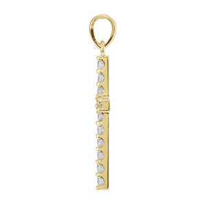 Celebrate and honor all special occasions with jewelry of religious significance! Our collection of spiritually inspired designs that show faith, hope and devotion are perfect for commemorating life's milestones. This Latin cross pendant created in 14k yellow gold is prong set with 16 natural diamonds that are 2.4mm in size, I1 in clarity and G-H in color. The total diamond weight is 3/4 carat. The approximate pendant size is 18mm (11/16 inch) in width by 32mm (1 1/4 inch) in length. The chain passage dimensions of the bail are 3.2 x 3mm. This item does not include a chain. This is a made to order item and is estimated to ship 11/24/2025