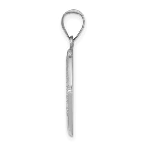 Celebrate and honor all special occasions with jewelry of religious significance! Our collection of spiritually inspired designs that show faith, hope and devotion are perfect for commemorating life's milestones. This St. Christopher (patron saint of travelers and motorists) pendant crafted in rhodium-plated 14k white gold features a hollow, satin and polished embossed design. The approximate size is 14mm (9/16 inch) in width by 28mm (1 1/8 inch) in length with the bail. This item does not include a chain.