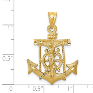 Celebrate and honor all special occasions with jewelry of religious significance! Our collection of spiritually inspired designs that show faith, hope and devotion are perfect for commemorating life's milestones. This mariner crucifix pendant crafted in 14k yellow gold features a solid, satin and diamond-cut design. The approximate size is 20mm (3/4 inch) in width by 31mm (1 1/4 inch) in length with the bail. This item does not include a chain.