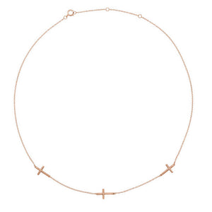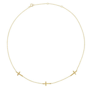 A simplistic yet elegant necklace design with a traditional or trendy style will give you a tailored look that goes from daytime wear to a night out on the town with ease. This multi-cross necklace created from 14k yellow gold features 5 sideways crosses stationed on a 1mm width solid cable chain that closes with a spring ring clasp. Each cross is approximately 8mm (5/16 inch) in width by 12mm (7/16 inch) in length. The solid cable chain adjusts in length from 16 to 18 inches. This is a made to order item and is estimated to ship in about 6-8 days. Please email service@theblackbow.com for more details.