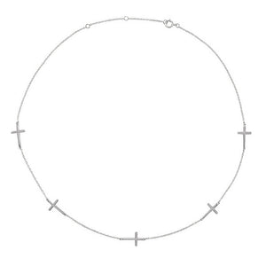 A simplistic yet elegant necklace design with a traditional or trendy style will give you a tailored look that goes from daytime wear to a night out on the town with ease. This multi-cross necklace created from rhodium plated 14k white gold features 5 sideways crosses stationed on a 1mm width solid cable chain that closes with a spring ring clasp. Each cross is approximately 8mm (5/16 inch) in width by 12mm (7/16 inch) in length. The solid cable chain adjusts in length from 16 to 18 inches. This is a made to order item and is estimated to ship in about 6-8 days. Please email service@theblackbow.com for more details.