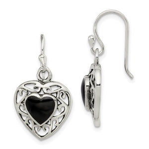 14mm Black Onyx Heart Dangle Earrings in Antiqued Sterling Silver - Black Bow Jewelry Company
