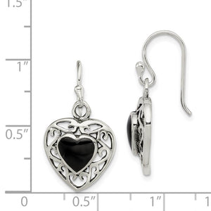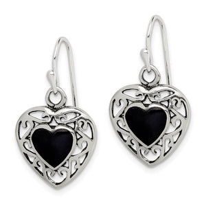 14mm Black Onyx Heart Dangle Earrings in Antiqued Sterling Silver