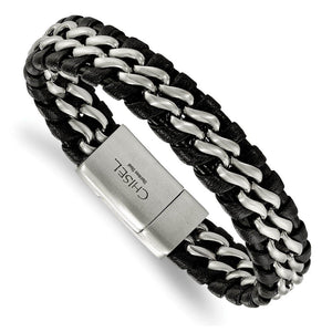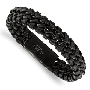 Change up your look with this 8.5-inch stainless steel and genuine black leather bracelet featuring a woven and brushed link design. It is approximately 14mm (9/16 inch) in with and closes with a magnetic clasp.