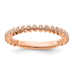 Make it simple and stylish with bands of different textures, finishes, widths and colors or extravagant with diamonds and gemstones! This stackable ring created from solid 14k rose gold features 15 genuine diamonds that are I2 in clarity and I-J in color. The total diamond weight is 1/20 of a carat. The approximate band width is 2.5mm. Guaranteed to fit together perfectly with all of the mix and match Stackable Expressions rings.