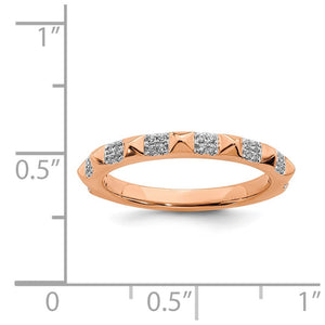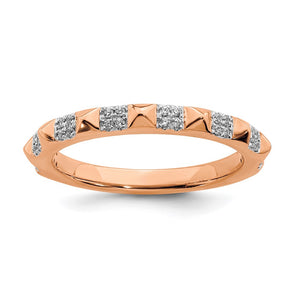 Make it simple and stylish with bands of different textures, finishes, widths and colors or extravagant with diamonds and gemstones! This stackable pyramid ring created from solid 14k rose gold features 24 genuine diamonds that are I2 in clarity and I-J in color. The total diamond weight is 1/8 carat. The approximate band width is 2.5mm. Guaranteed to fit together perfectly with all of the mix and match Stackable Expressions rings.