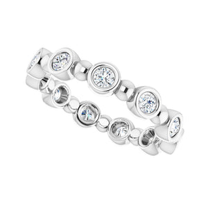 • Bezel set in rhodium-plated 14k white gold are 11 round, SI2-SI3 clarity, G-H color, 2.5mm natural diamonds totaling 1/2 of a carat. This standard fit, size 6 eternity band is approximately 3. Mm in width by 1. Mm in thickness and the top height is about 1. Mm. This is a made to order item and is estimated to ship 12/1/2025