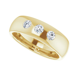 Sleek and simple with a classic half round design created from 14k yellow gold. This 6mm wide, comfort fit band is gypsy set with 3 white diamond that are SI2-SI3 in clarity and G-H in color. Total diamond weight is 1/3 carat. Suitable for engraving. This is a made to order item and is estimated to ship 12/1/2025
