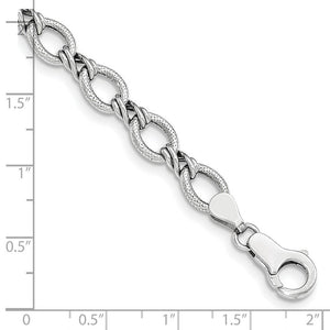 Casual to dress versatility featuring a polished fancy link design fashioned from rhodium-plated 14k white gold. This unique hollow chain bracelet is finished with a fancy lobster clasp and is approximately 7.5mm (1/4 inch) in width by 7 inches in length.