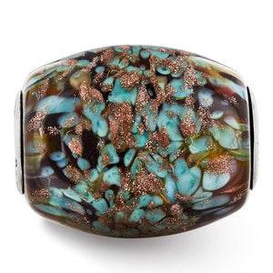Each meticulously hand-blown Fenton glass charm is finished with a sterling silver core embossed with Fenton USA! This glitter accented charm features a multicolor barrel design that is approximately 20mm in width by 10mm in length. Fenton Made in America handcrafted glass beads are interchangeable as well as compatible with other popular 3mm width bead style bracelets and necklaces. Colors and size may vary slightly.
