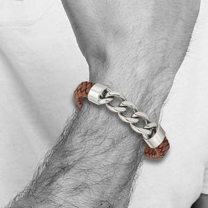 Men's Stainless Steel & Brown Leather Curb Link Bracelet, 8.25 Inch