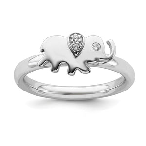 Create a look that is all your own with a fun assortment of rings that looks great alone or stacked in a collection to express your own unique style. This diamond-accent ring fashioned from rhodium-plated .25 sterling silver features an 7 x 13mm elephant atop a 2. Mm width band. The 3 natural diamonds are I2 in clarity and I-J in color. The total diamond weight is .3 of a carat. Guaranteed to fit together perfectly with all of the mix and match Stackable Expressions rings.