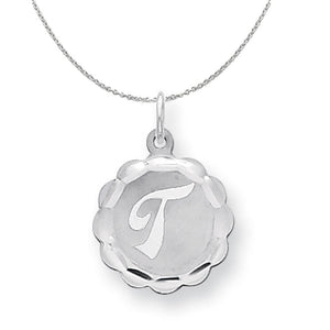Silver, Sarah Collection 15mm Brocaded Disc Initial T Necklace