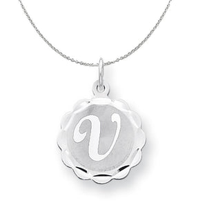 The brocaded disc with its contrasting satin and polished design adds a touch of glamour to your favorite initial. It is fashioned from solid sterling silver, finished with a classic jump ring that fits up to a 3mm width chain and has a polished back that is suitable for engraving. Includes a 1.25mm, 16 inch sterling silver cable chain.
