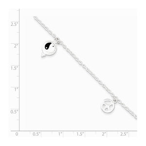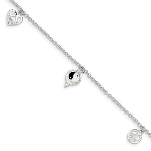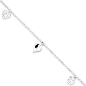 Add sensational style to your outfit with this sterling silver anklet that features three charms dangling from a 2mm cable chain finished with a fancy lobster clasp. The 8mm charms include a fancy open heart, an enameled yin yang and an open peace symbol (not shown). It is also adjustable in length from 8 to 9 inches.