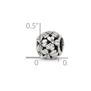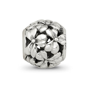 Spruce up your jewelry design with a beautiful, intricately detailed floral bead that nature inspired. This openwork flower charm is created from antiqued sterling silver and measures approximately 8mm in width by 9mm in length with a 4mm core. All of our charms are interchangeable as well as compatible with Reflections and other popular 3mm width bead style bracelets and necklaces.