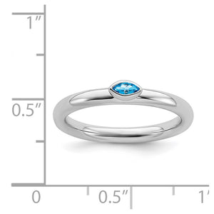 Blue Topaz, December's birthstone symbolizes eternal love and faithfulness inspiring clarity and concentration. This 2. Mm band fashioned from rhodium plated sterling silver is bezel set in a low profile mounting with a 4 x 2mm genuine marquise gemstone that will add a touch of color to your finger. The color range varies on all genuine gemstones so please allow for slight variations in shades (bright, light to medium light blue). The color on your screen may also not reflect actual gemstone color due to variations in monitors. Gemstone treatment: traditional irradiated process. Guaranteed to fit together perfectly with all of the mix and match Stackable Expressions rings. This item is backordered and we estimate it to ship in approx. 10-12 days. Please email service@theblackbow.com for more details.