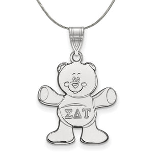 Show your greek life spirit with this Sigma Delta Tau Sorority pendant necklace. It is crafted with rhodium plated sterling silver and without the bail is 21mm in height and 19mm in width (0.83 in x 0.75 in). With the bail, the measurements are 27mm in height and 19mm in width. We are a certified LogoArt retailer and this authentic item is licensed by the Sigma Delta Tau Sorority and Greek Life. This pendant necklace is made the USA. Includes a 16 Inch, 1.25mm sterling silver franco chain.