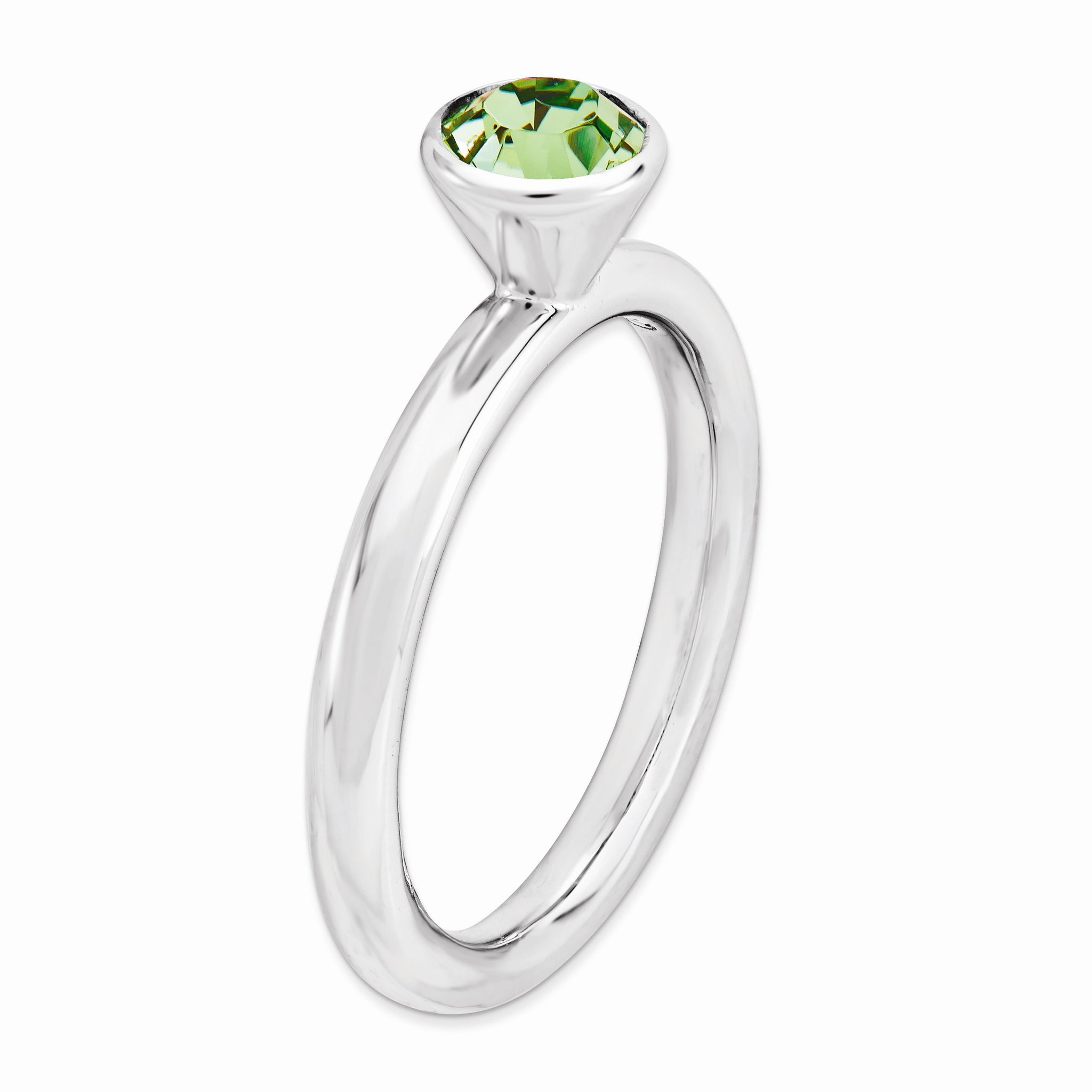 Use this simulated birthstone ring to symbolize an important month or use multiples to create a personalized family combination. Representing the month of August, this 2.5mm band fashioned from rhodium plated sterling silver is bezel set in a high profile mounting with a 5mm pale green crystal that will stand out and make a statement. Guaranteed to fit together perfectly with all of the mix and match Stackable Expressions rings.
