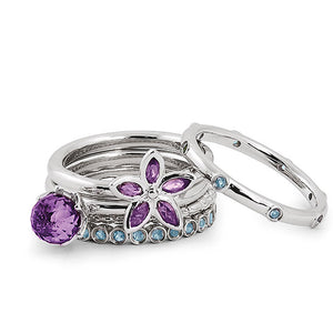 Sterling Silver Stackable Amethyst & Blue Topaz Flower Ring Set