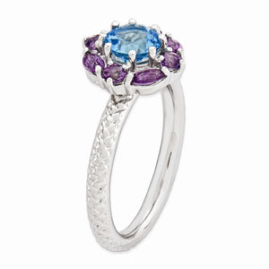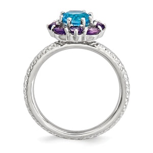 Four round and four marquise amethyst stones highlight a brilliant 1 carat blue topaz in this floral gemstone design that is prong set atop a 2. Mm rhodium plated sterling silver band finished with a textured design. Wear it alone or featured in a meaningful collection. Guaranteed to fit together perfectly with all of the mix and match Stackable Expressions rings.