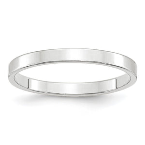 A sleek contemporary style band created in rhodium-plated 10k white gold with a polished finish. This women's band features a flat profile, a standard fit shank, is approximately 1.2mm in thickness (lightweight), and 2.5mm in width. Made in the U.S.A.