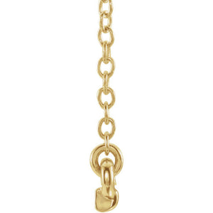 A simplistic yet elegant necklace design with a contemporary style featuring a small straight bar pendant and adjustable 16-18 inch length chain fashioned from 14k yellow gold and 9 genuine diamonds totaling 1/15 carat. The pendant is approximately 1.5mm in width by 12mm (7/16 inch) in length and the attached 1mm solid cable chain is finished with a spring ring clasp. Each natural round diamond is I1 in clarity and H-I in color.