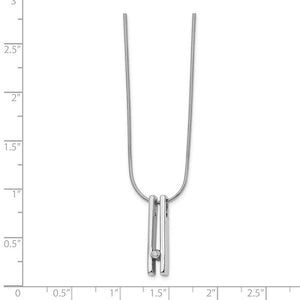 A timeless classic design featuring an adjustable length necklace made from tarnish resistant, rhodium plated sterling silver accented with a single white diamond. The double bar pendant is approximately 5mm (3/16 inch) in width by 22mm (7/8 inch) in length. It comes ready to wear on 1mm width, 18 inch long snake chain finished with a lobster clasp and 2-inch extension for flexibility. The natural.02-carat diamond is I2 in clarity and H-I in color.