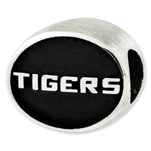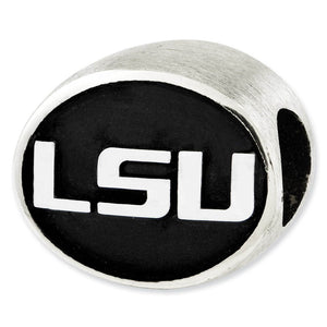 Show your LSU spirit with this enameled sterling silver collegiate charm that reverses to reveal the name Tigers. It measures approximately 10 x 12mm with a 4mm core that is interchangeable as well as compatible with Reflections and other popular 3mm width bead style bracelets and necklaces. The school colors of purple and gold are available in our crystal charms.
