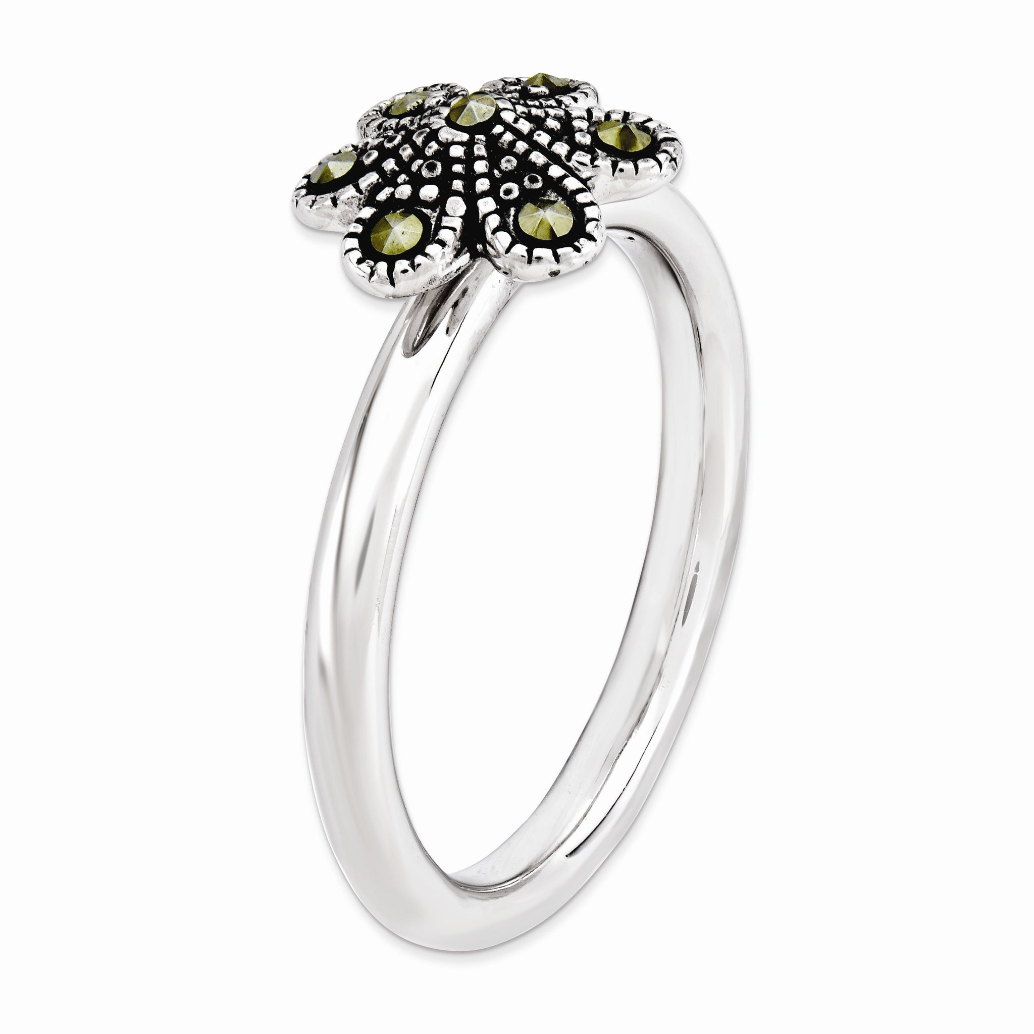 Fun and whimsical, appealing to all ages and can be worn alone or featured in a collection. This 2.5mm rhodium plated sterling silver band features a 10mm decorative flower accented with 7 sparkling marcasite stones. Guaranteed to fit together perfectly with all of the mix and match Stackable Expressions rings.
