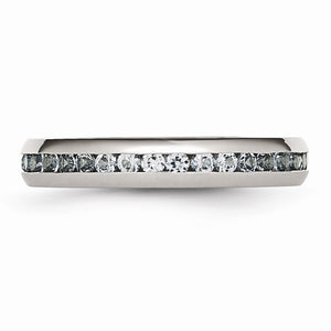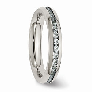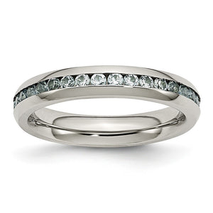 Wear alone or mix with other stack rings to create your own look! This 4mm eternity band fashioned from polished 316L stainless steel is channel set with light blue cubic zirconia gemstones all the way around.