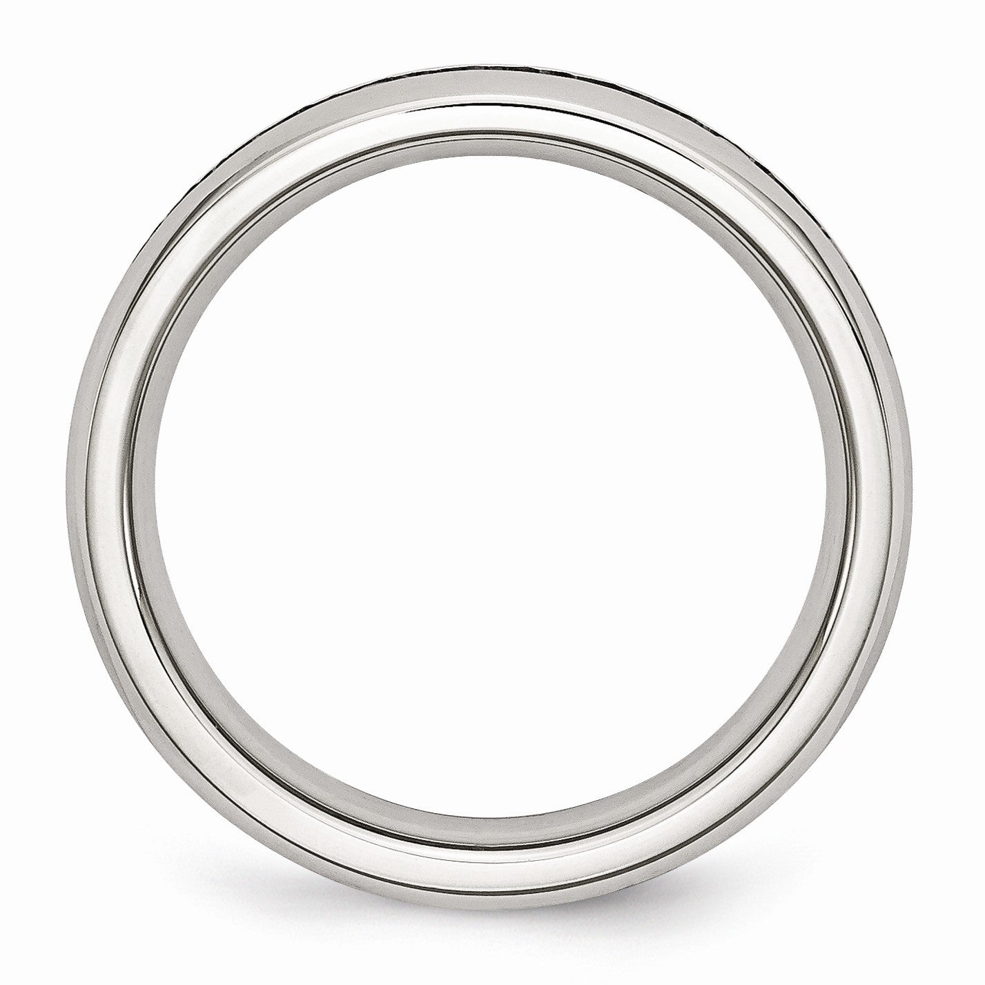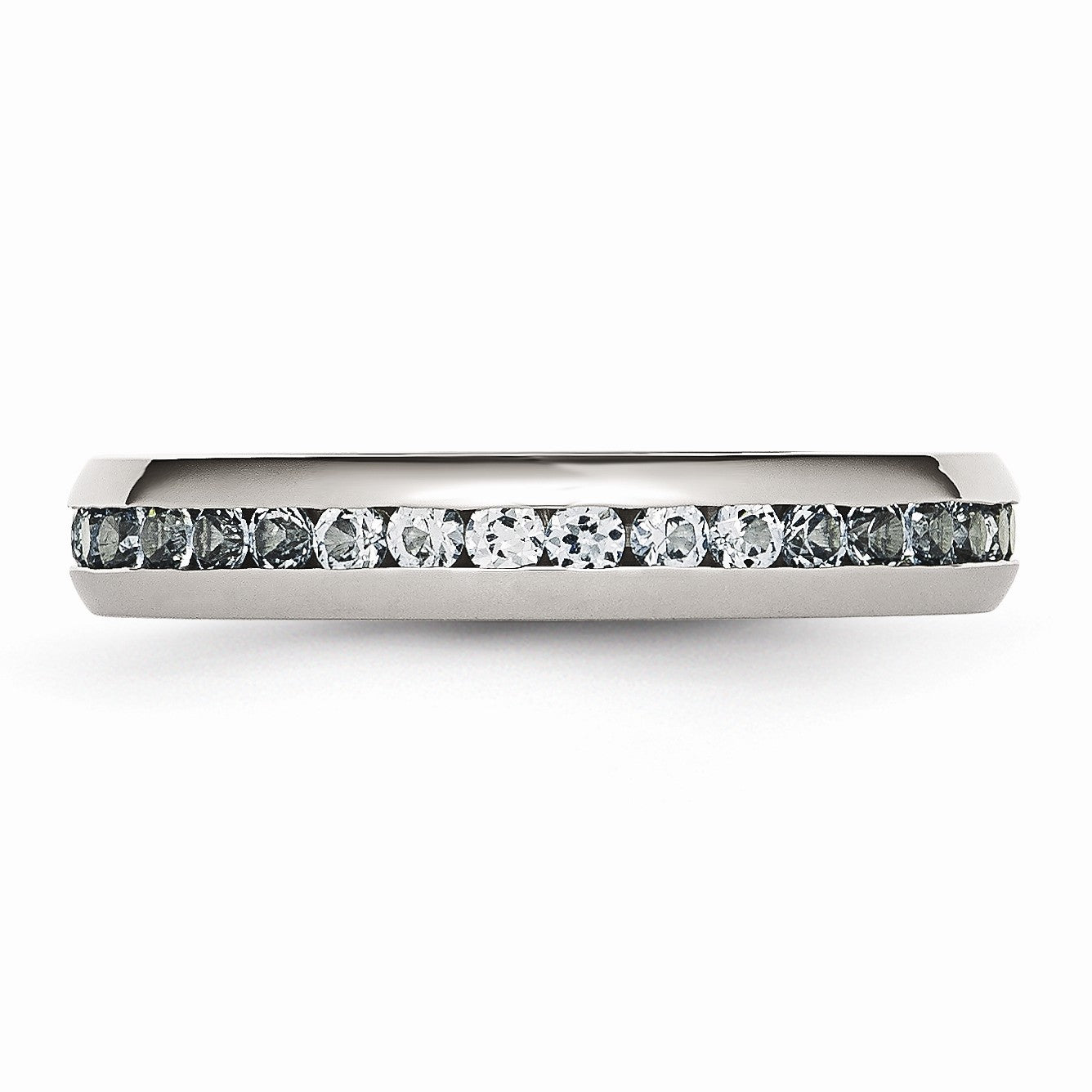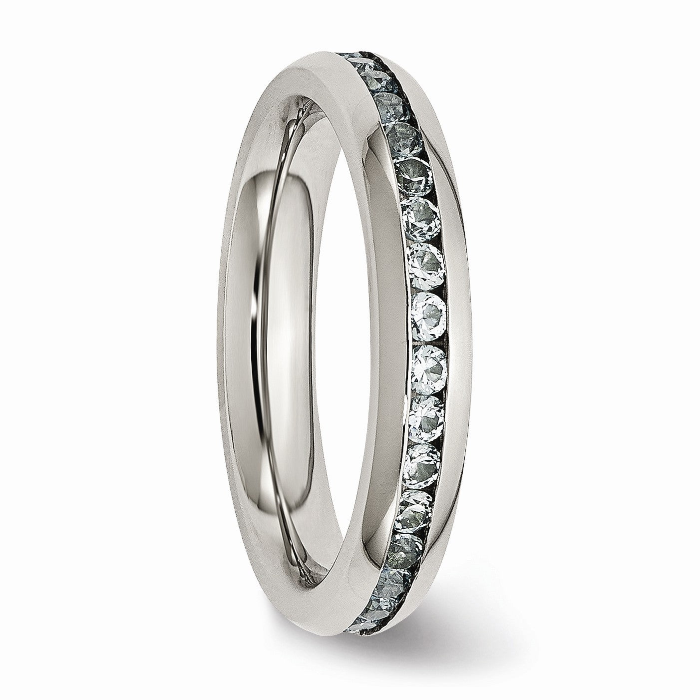 • Wear alone or mix with other stack rings to create your own look! This 4mm eternity band fashioned from polished 316L stainless steel is channel set with light blue cubic zirconia gemstones all the way around.