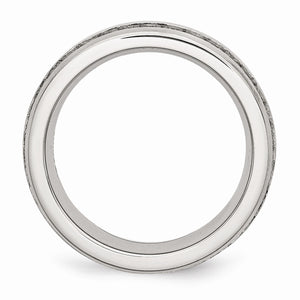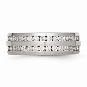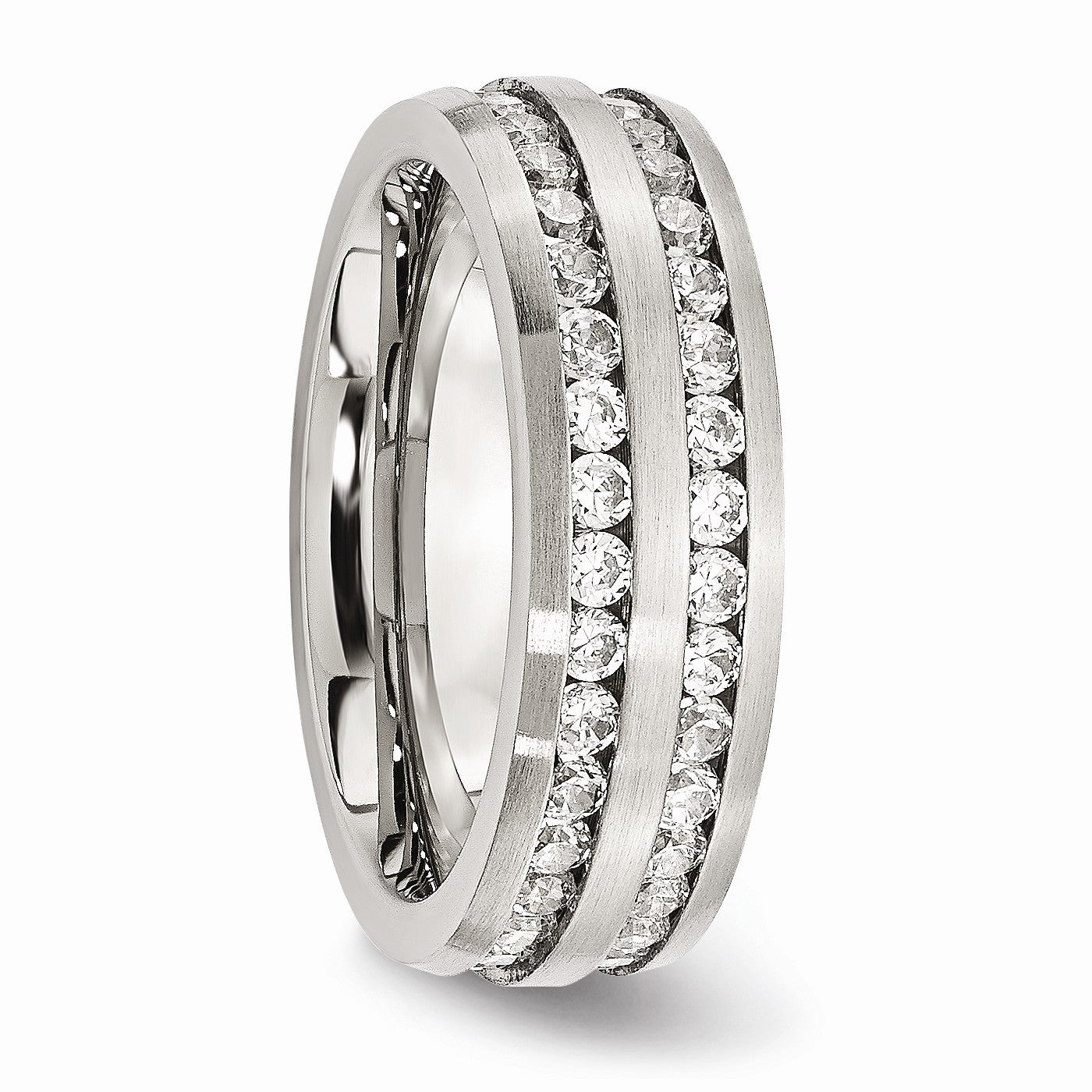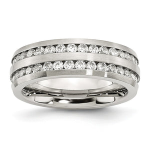 Keep it simple and classy with this 7mm standard fit band featuring a double row of white cubic zirconia gemstones channel set in brushed stainless steel.