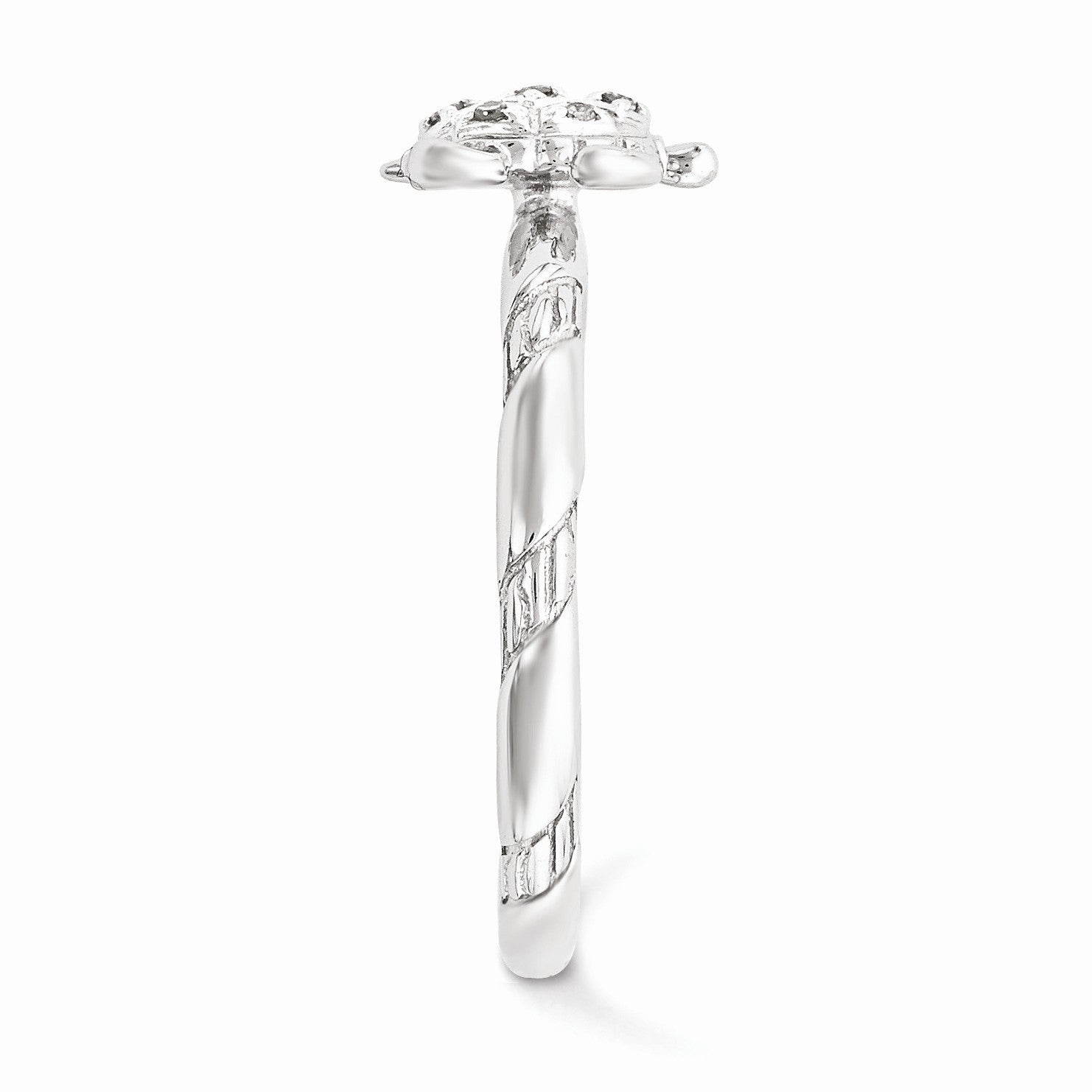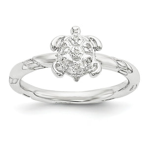Create a look that is all your own with a fun assortment of rings that looks great alone or stacked in a collection to express your own unique style. This polished theme ring fashioned from tarnish resistant rhodium plated sterling silver features a 9 x 8mm turtle pave set with seven natural diamonds and a 2.5mm width textured band. The white diamonds are H-I in color, I3 clarity and the total diamond weight is 0.35 carat. Guaranteed to fit together perfectly with all of the mix and match Stackable Expressions rings.