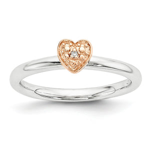 Create a look that is all your own with a fun assortment of rings that looks great alone or stacked in a collection to express your own unique style. This polished two-tone ring fashioned from tarnish resistant rhodium plated sterling silver features a 5mm rose gold tone plated heart pave set with one natural diamond and a 2.5mm width polished band. The 1/2 point white diamond is H-I in color and I3 clarity. Guaranteed to fit together perfectly with all of the mix and match Stackable Expressions rings.