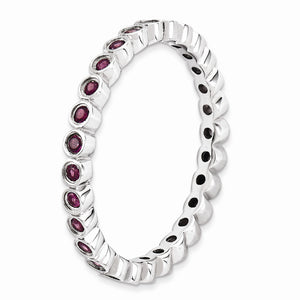 Rhodolite Garnet, June's birthstone is known to encourage meditation and thought as well as inspiring love and self-confidence. This 2.5mm wide band fashioned from rhodium plated sterling silver is bezel set with 1. Mm round faceted natural gemstones all the way around. The color range varies on natural gemstones so please allow for slight variations in shades. Guaranteed to fit together perfectly with all of the mix and match Stackable Expressions rings.