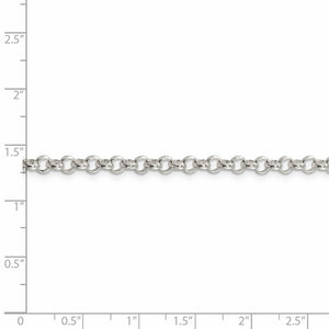 Sleek and chic, a polished sterling silver rolo chain featuring broad solid links with a domed design. Its versatile and attractive style makes it an excellent choice as a solo chain or combined with multiple chains for a layered look. This bracelet is approximately 4mm in width, 7-inches in length and closes securely with a lobster claw clasp.