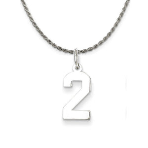 Celebrate your favorite sports player, lucky number or milestone date in your life with a prominent rhodium-plated sterling silver charm. This laser cut polished number is approximately 18mm (11/16 inch) in length and is finished with a classic jump ring. Includes a flexible and strong diamond cut rope chain. This stunning chain is 2.25mm in width, 20 inches in length and features a sturdy lobster claw clasp. The chain is crafted in Italy.