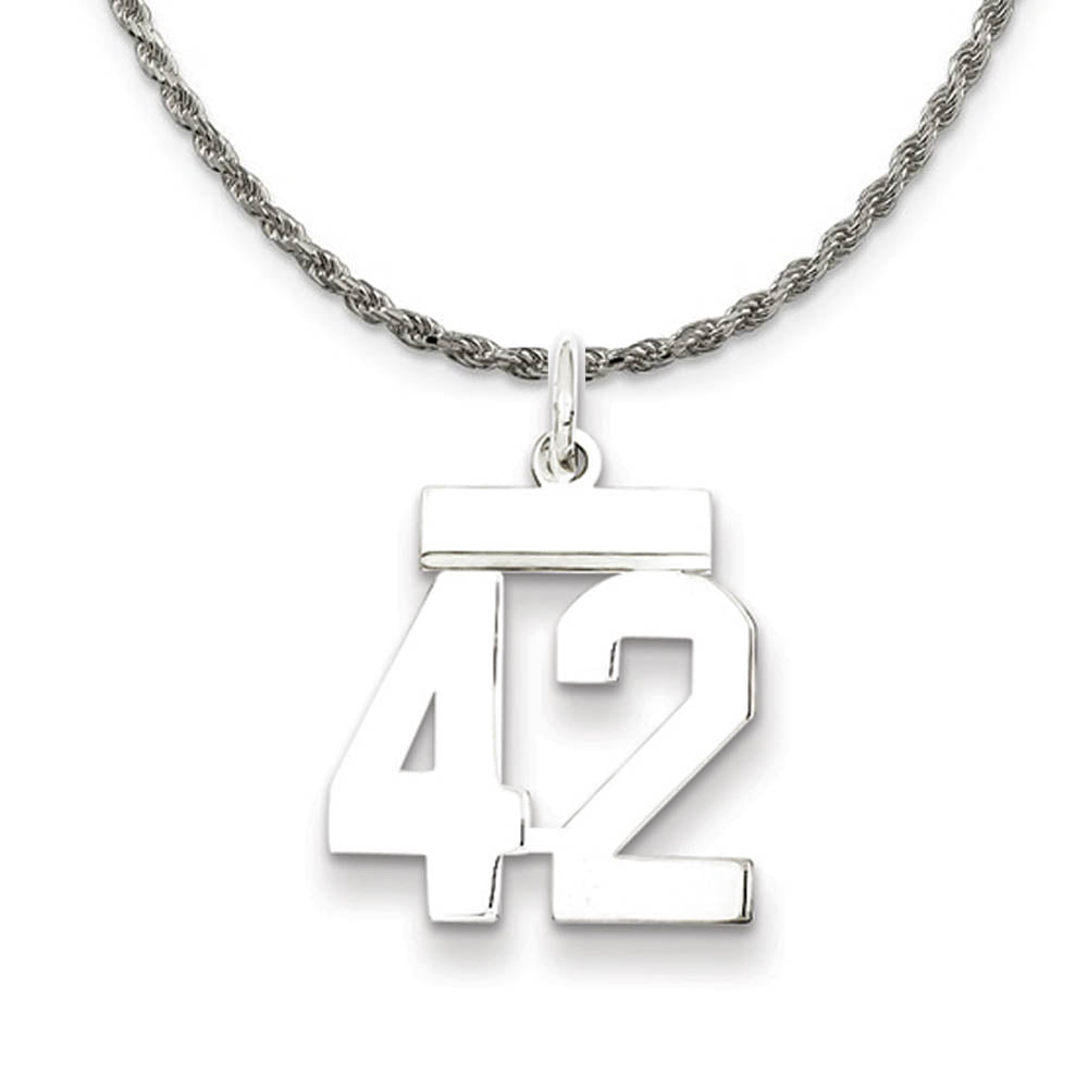 Celebrate your favorite sports player, lucky number or milestone date in your life with a prominent rhodium-plated sterling silver charm. Each polished number is approximately 18mm (11/16 inch) in length, which is finished with a 2mm top bar and a classic jump ring. Includes a flexible and strong diamond cut rope chain. This stunning chain is 2.25mm in width, 26 inches in length and features a sturdy lobster claw clasp. The chain is crafted in Italy.