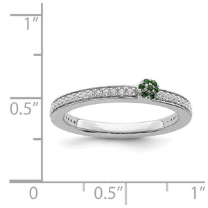 Make it simple and stylish with bands of different textures, finishes, widths and colors or extravagant with diamonds and gemstones! This stackable ring created from rhodium-plated 14k white gold features 7 lab created-emeralds totaling .45 of a carat and 24 genuine diamonds totaling 1/8 carat. The natural diamonds are I2 in clarity and I-J in color. The color range varies on all genuine gemstones so please allow for slight variations in shades (medium dark to dark color). The color on your screen may also not reflect actual gemstone color due to variations in monitors. The approximate band width is 2mm and the top head width is 3mm. Guaranteed to fit together perfectly with all of the mix and match Stackable Expressions rings.