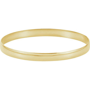 Sometimes the most beautiful things are also the most basic. This solid slip-on style bangle bracelet made from polished 14k yellow gold is approximately 6mm in width by 7.75 inches in circumference. Suitable for engraving.