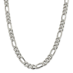 Displaying a modern design with a pave texture and flat profile that provides added dimension and style, this solid link sterling silver Figaro chain will give any outfit a glamorous touch. Measures approximately 10.5mm in width by 24-inches in length, closes with a lobster claw clasp and is especially suited for the well-dressed man. Made in Italy.