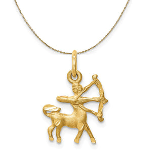 Sagittarius zodiac sign, the Archer. The Centaur, teacher of wisdom, rides through the sky with his bow, arrow, and quiver. This 14k gold charm features a satin finish with diamond-cut accents, measures approximately 13mm (1/2 Inch) in width by 17mm (5/8 Inch) in length and dangles from a classic jump ring. The pendant is . Includes a 20 inch, 0.8mm 14k yellow gold cable chain with a lobster clasp.