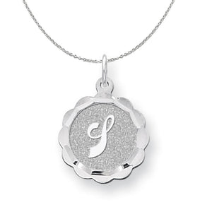 The brocaded disc with its contrasting satin and polished design adds a touch of glamour to your favorite initial. It is fashioned from solid sterling silver, finished with a classic jump ring that fits up to a 3mm width chain and has a polished back that is suitable for engraving. Includes a 1.25mm, 16 inch sterling silver cable chain.