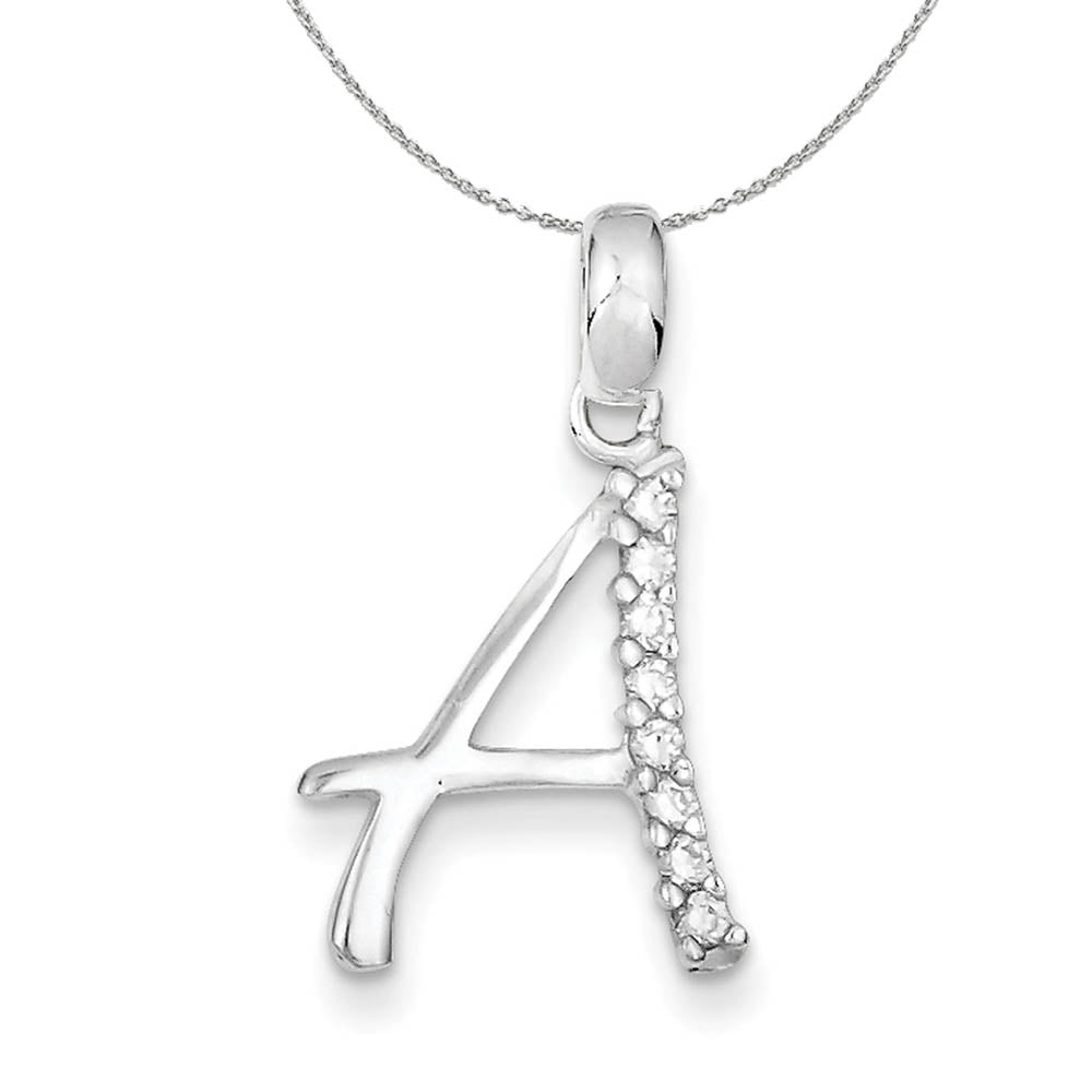 Adding a touch of glamour to your favorite initial is eight prong-set clear cubic zirconia gemstones. This gleaming pendant is fashioned from sterling silver and will fit up to a 4mm width classic style chain. Each letter A is approximate 14mm (9/16 inch) in width by 23-24mm (15/16 inch) in length, which includes the bail. Includes a 1.25mm, 16 inch sterling silver cable chain.