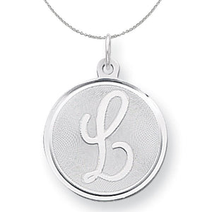 The 20mm (3/4 inch) brocaded disc with its contrasting satin and polished design adds a touch of glamour to your favorite initial. It is fashioned from solid sterling silver, finished with a classic jump ring that fits up to a 3mm width chain and has a polished back that is suitable for engraving. Includes a 1.25mm, 20 inch sterling silver cable chain.