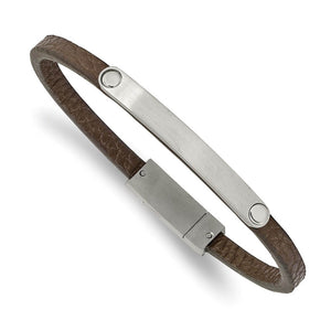 Identify yourself, remember a special person or display a meaningful message with this unisex 8.25 inch ID bracelet. It is crafted from brushed stainless steel and brown leather. The center ID plate is approximately 46mm (1 3/4 inch) long by 6mm (1/4 inch) wide and of course, is suitable for engraving. The 5mm width, leather bracelet closes with a magnetic clasp.