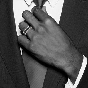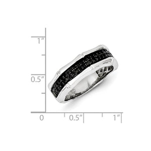 Round black diamonds and a grooved design adds a contemporary flair to the elegant traditional styling of this men's 7mm width band that is fashioned from tarnish resistant rhodium-plated sterling silver. It features a fancy undercarriage, a two tone polished finish, a tapered fit and prong-set heat-treated black diamonds totaling 3/8 carat. Available in whole sizes 9-11 only.